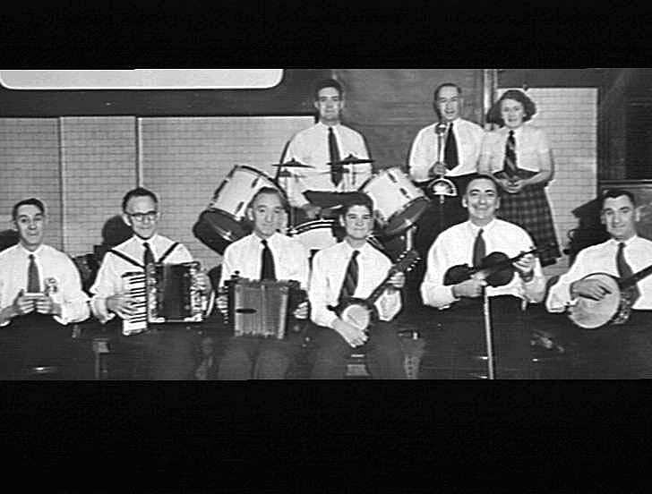Photograph of "The Sunshine Factory Novelty Band at a social evening for workers", September 1948. The band performed at a variety of social functions organised by the Sunshine Harvester Works.