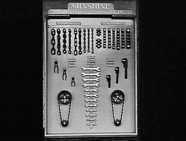 Royal Show Melbourne: Engineering Products: 22nd Sept 1946. Shown are welded coil-chain, steel sprocket-chain, Sunshine pliers, cadmium-plate double-ended spanners and Sunshine wrenches. Also shown are chains on sprockets.