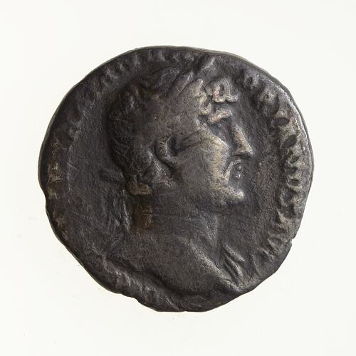 Laureate bust of Hadrian facing right, drapery on left shoulder; around, IMP CAESAR TRAIAN HADRIANVS AVG