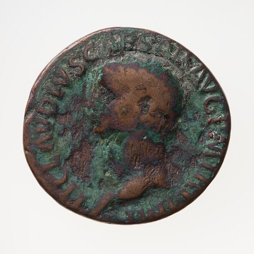 Copper As of the Emperor Claudius, Ancient Roman Empire, probably struck in the period 41 to 50 AD but production could have continued a little longer. Minted by Rome. Although the gold and silver coins of Claudius show numerical changes in TRP and IMP which can be translated to dates, the aes coinage is almost unchanged (with the exception of the addition of PP in 50 AD). This coin, with no PP at the end of the obverse legend is therefore only broadly dated to between 41 and 50 AD.