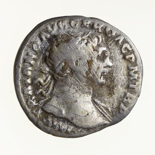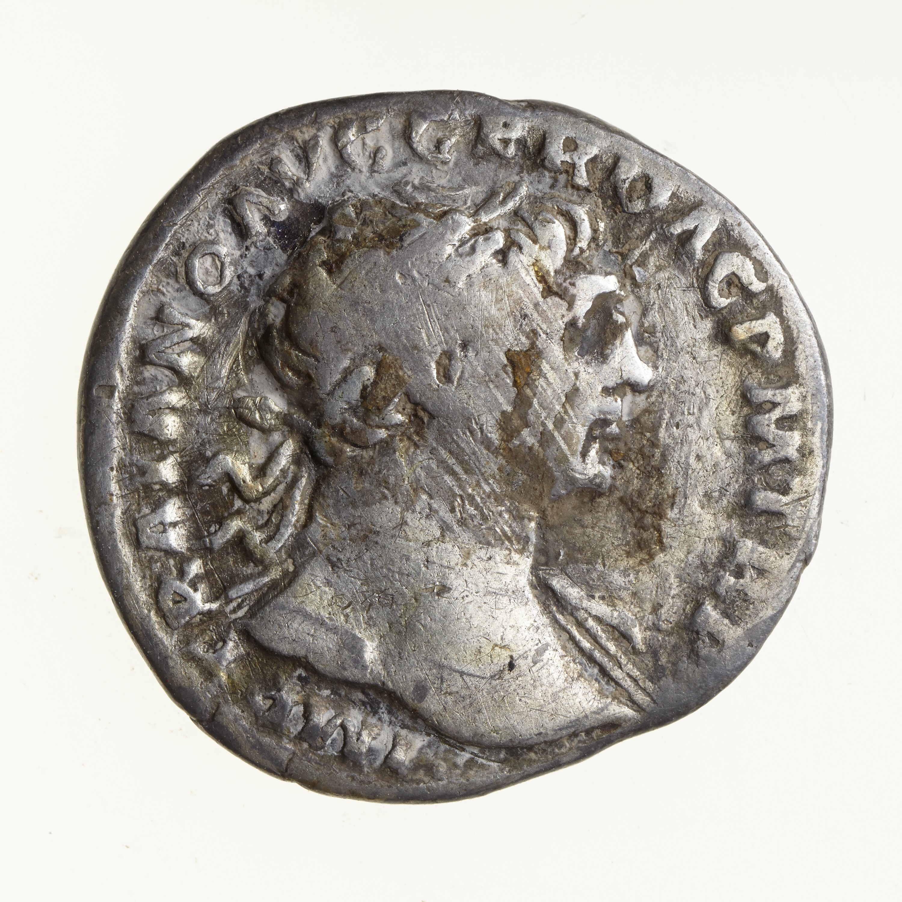 Laureate head of Trajan facing right, drapery on left shoulder; around, IMP TRAIANO AVG GER DAC PM TR P