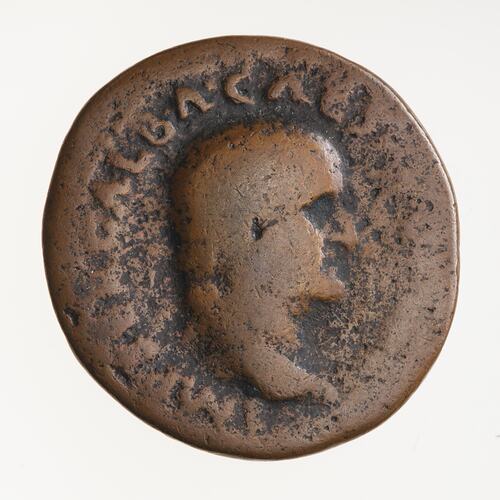 Copper As struck during the reign of the Emperor Galba between July 68 and January 69 AD, Ancient Roman Empire. Minted by Rome. The extent and position of the wear on this coin make it impossible to determine the full content of the obverse legend and hence to tie down the date of production of the coin any further.