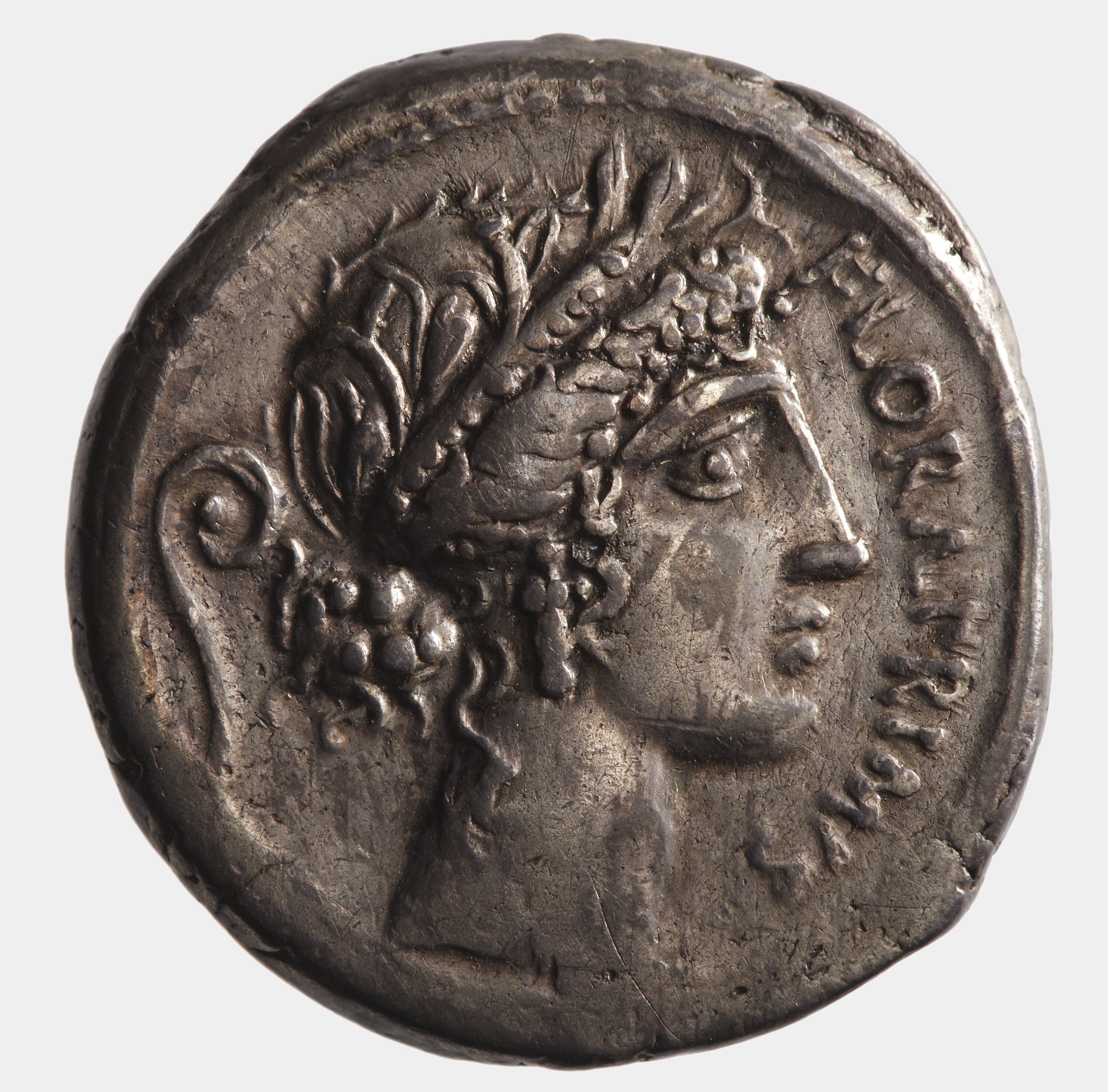 The moneyer is not known other from his coin issues and the reasons for the choice of obverse and reverse types is unclear. Flora was the Italian goddess of flowering or blossoming plants. She had a priesthood in Rome, the flamen Florianus. A temple was dedicated to her on 28 April 238 BC and from 173 BC games were held in her homour on that day. The coin type may refer to these events.
