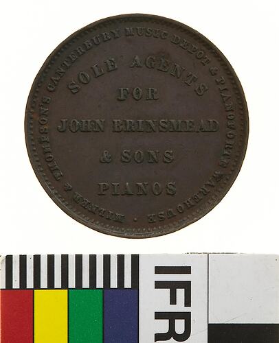 Copper One Penny Token, minted by Stokes & Martin, Melbourne. Issued by Milner & Thompson, Canterbury Music Depot, Christchurch, 1881. Milner & Thompson's Music store, the Canterbury Music Depot, was opened in 1874 by Robert Thompson, some time soon afterwards he took John Milner into partnership and they worked together for 21 years. When Milner retired Thompson continued in the business until he passed it to his sons in 1907. The business was bought by Charles Begg and Co. in 1920, and was still a going concern in 1950. Milner & Thompson were the last issuers of tokens in New Zealand. The firm had a number of novel advertising schemes, in addition to the tokens. They installed a 'phantom piano' on the ground floor, which was set up to give the appearance of being played, while it was in fact being operated from a keyboard and set of pedals installed in the basement below. Thompson also ran a Booking Office for plays from the store from 1881, the first production advertised being staged by the Montague-Turner Opera Co. of Sydney.