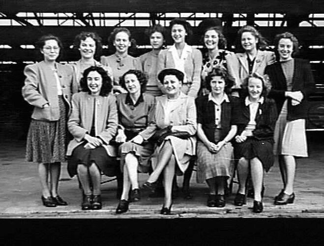 Black and white photograph of women from the H.V McKay Massey Harris firm. They were employed in the Perth Office and were involved in raising money for the "Food for Britain" appeal which continued after World War Two.