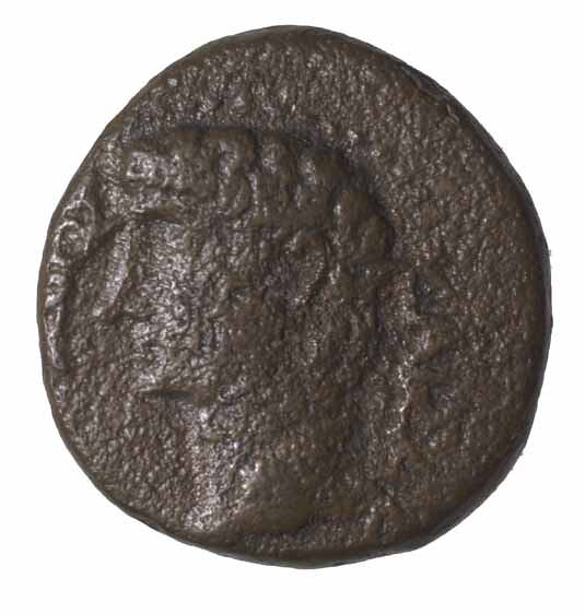 Head of Claudius bare facing left, around in Greek (mostly off flan or corroded away) {[ti.klausios] KAISAR}