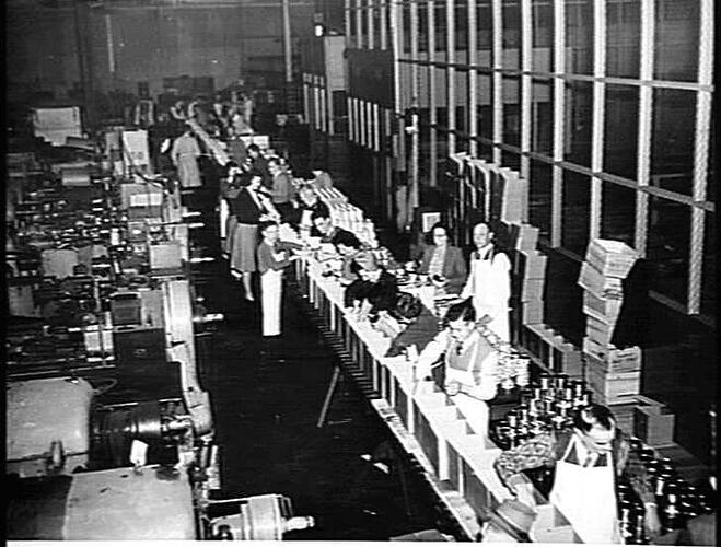 Black and white photograph of H.V McKay Massey Harris packing food parcels for the Food for Britain Appeal in Sunshine in October 1947.