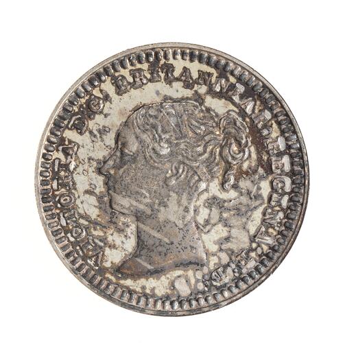 Head of the Queen with plain band an fillet around hair; around, VICTORIA D:G: BRITANNIAR: REGINA F:D: