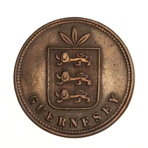States of Guernsey shield of arms, 3 lions; around below, GUERNESEY