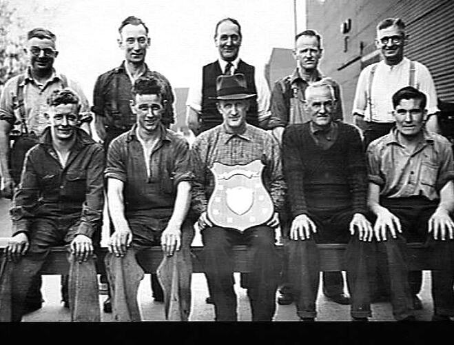 Group of ten men standing and seated in two rows. Extract from Sunshine Review Dec. 1945: "The annealing team, winners of the Quoit Club's popular midday tournament are shown, together with some of their supporters: back L to R: Jack Evans, Syd Hunter, Sam Boreham, Frank Curnow, Jim Bird: Front: Erniw Landers, Alex Saunders, Harold Cameron, Mat Peel, Jack McMasters."