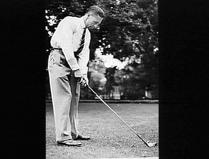 Stamped: "H.V. MCKAY MASSEY HARRIS PTY LTD SUNSHINE. NOV 1945" "2938" Caption attached to image in Sunshine Review, December 1945: "Dave Green, winner of our Golf Club 's 'C' grade championships, shows how it is done. Dave is employed in the Duplicates Department".