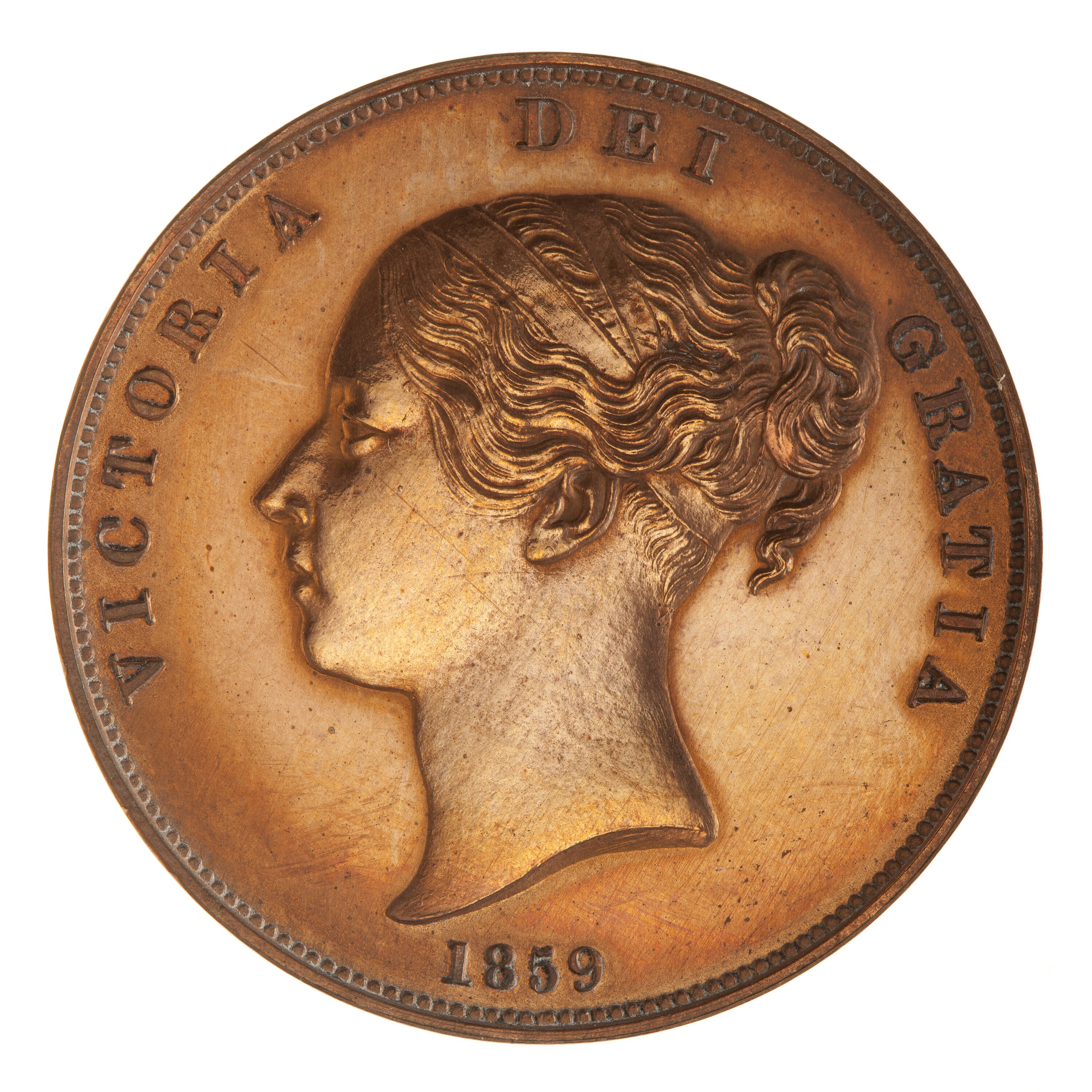 Head of Queen Victoria facing left, plain bands in hair; below, 1860; around above, VICTORIA DEI GRATIA