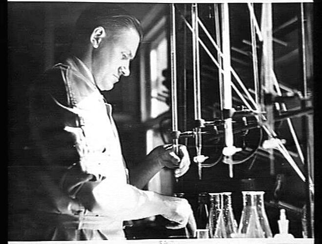 'Chemist, Jim Scott, is engaged on one of his daily tasks, in the laboratory, and is shown operating a burette when making a chemical analysis of an iron sample. The materials used in Sunshine products are subject to strict chemical and physical control.'.