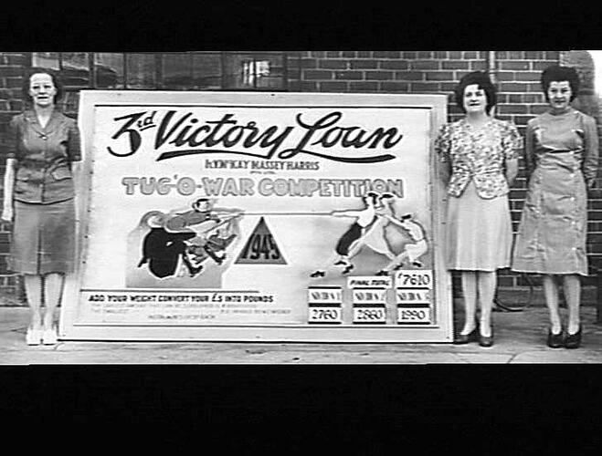 Black and white photograph of three H.V McKay Massey Harris employee who organised a tug-of-war competition to raise funds for the Third Victory Loan Campaign in May 1945. A total of 510 subscribers raised £7,610.