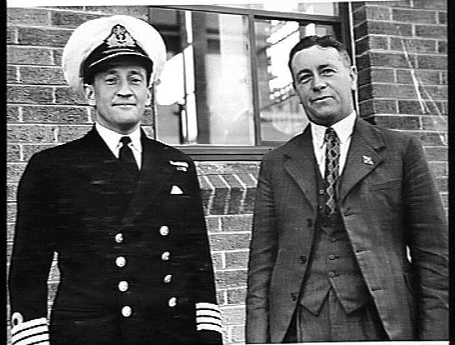 'Captain R.C.M. Duckworth O.B.E. of the Royal Navy was the guest speaker at the third Victory Loan Rally held in March. The captain is shown here with Jack Thorpe, secretary of the War Loans Committee. Jack Thorpe has rejoined the staff after 4 & half years. Captain Duckworth was a staff officer with the British Pacific Fleet.