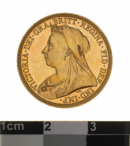 A proof gold coin (21.5 mm diameter with plain edge) featuring a crowned bust of Queen Victoria facing left, veiled and draped, wearing ribbon and Star of Garter; around VICTORIA . DEI . GRA . BRITT. REGINA . FID . DEF . IND . IMP . , the artist's initials, T.B. are below the bust. The reverse features St. George on horseback holding short sword in right hand, wearing a flowing cape, helmet and boots; the horse rearing to right over a fallen dragon which has a broken lance in its chest; the date, 1893 in the exergue. The mint mark S is in the ground above the middle of the date.