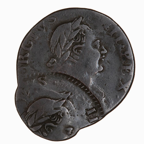 Laureate bust of the King facing right struck a second time across bust; around GEORGIVS III REX