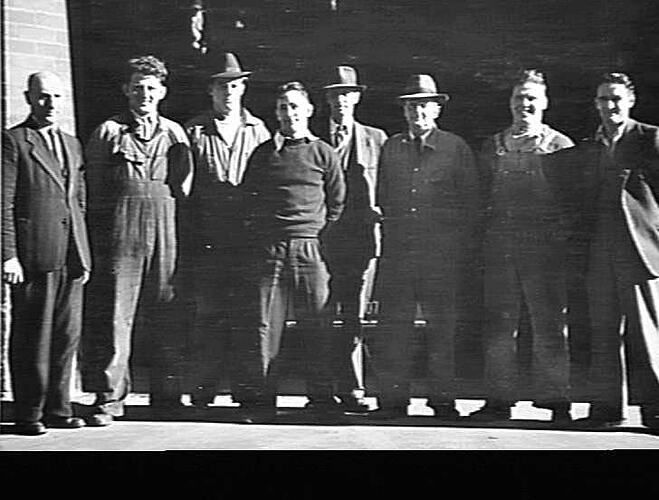 Black and white photograph of the Bulk Store team who worked for H.V McKay Massey Harris. Men pictured from left to tight: Bill Prince, Larry Spokes, Gunars Putnins, Noel Howie, Herb McDuff, Alan Farnbach, Mardan Byrne and Leo Ryan.