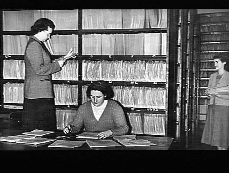 Black and white photograph of the staff in the H.V McKay Massey Harris Records Department, located in the company's head office. The Department were in charge of personnel and company records. Photo shows Betty Snaith, Edna Rigby and Doreen McKenna.