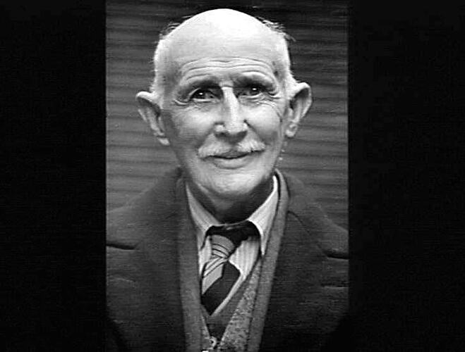 Close-up portrait of an elderly man looking to the left of the camera. Extract of caption from the Sunshine Review July 1950: 'A welcome visitor: Mr Fred Carter, the first man to work in the office of HV McKay, Ballarat, paid a visit to Sunshine early in June [1950]. In February 1910, after about 12 years service, Mr Carter resigned to go farming in Western Australia.'