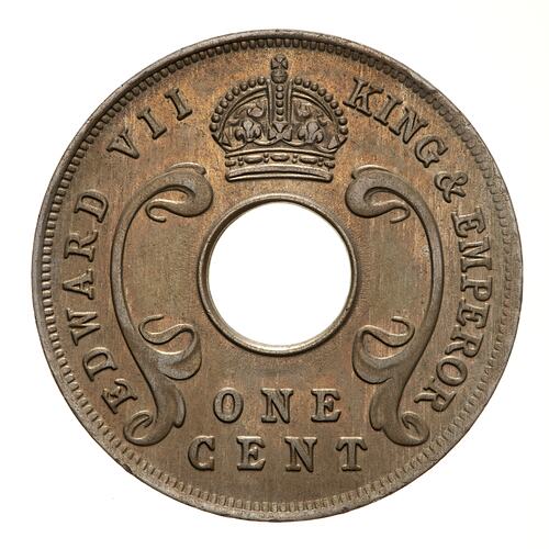 A central hole with curved floral design to left and right; above hole, crown; below hole in two lines, ONE / CENT; around, EDWARD VII KING & EMPEROR