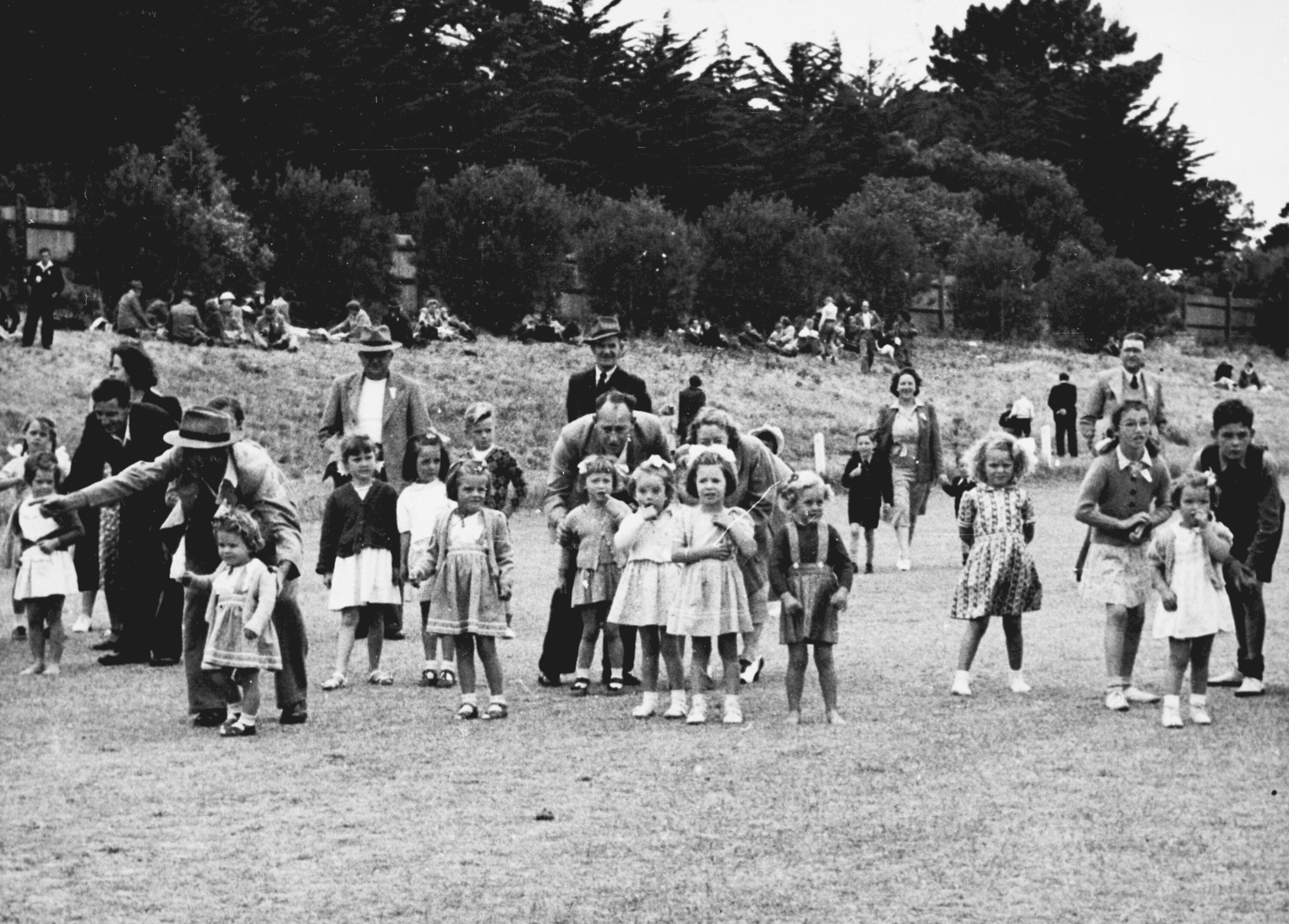 Black and white photograph showing the start of the female toddlers race at H.V. McKay Massey Harris picnic held at Frankston in 1949.