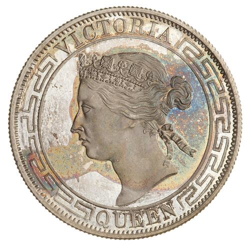 Supplied to the Sydney Branch of the Royal Mint for their display at the Sydney International Exhibition 1879-80. It is believed the proofs were struck in London (where the dies were made), while the working strikes were from the Hong Kong Mint. This coin was sold to the donor at the closure of the Sydney Mint in 1926.
