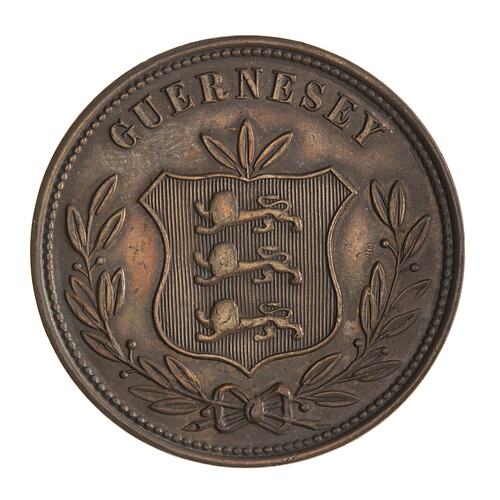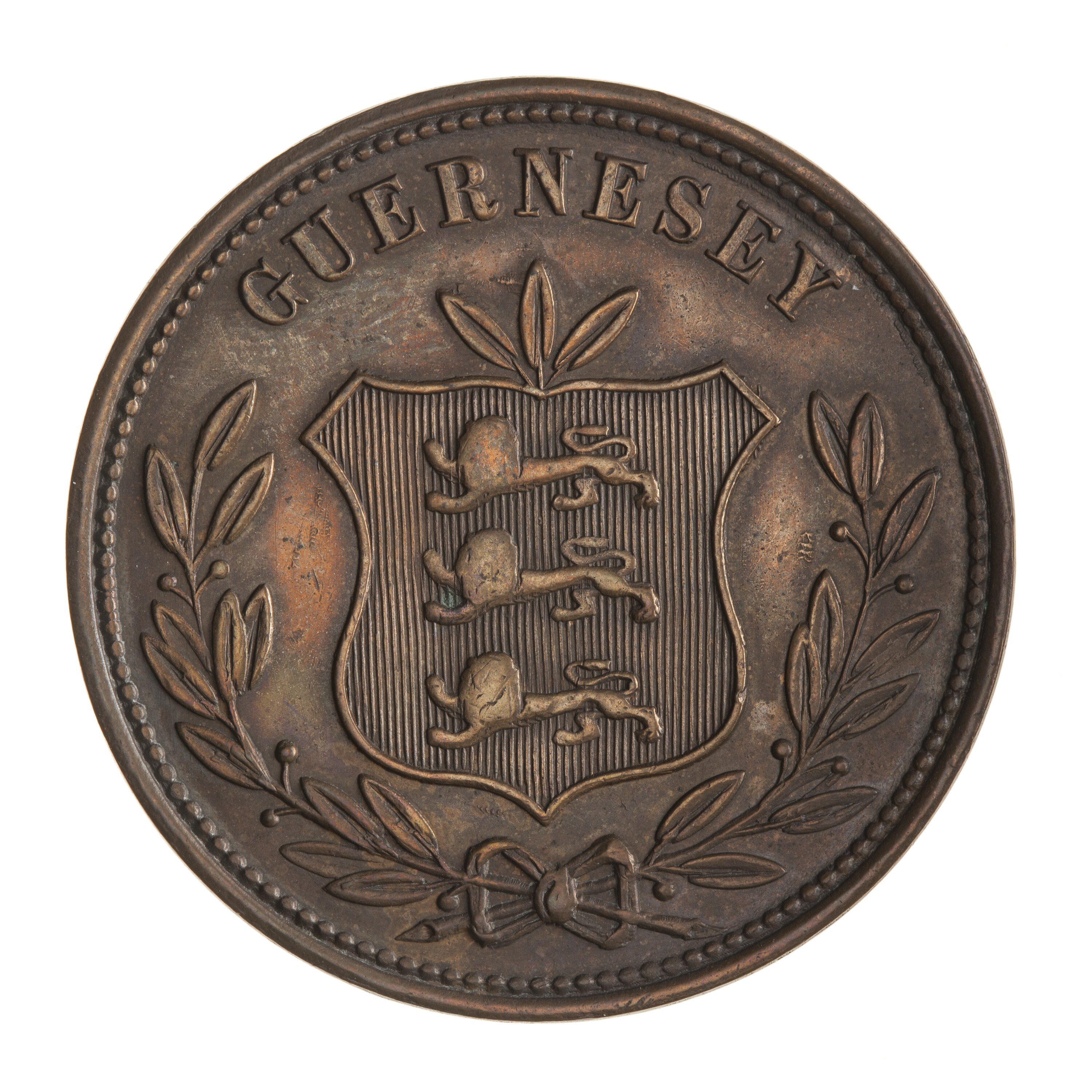Shield of arms of Guernsey, three lions to left; around above, GUERNESEY; below, open laurel wreath