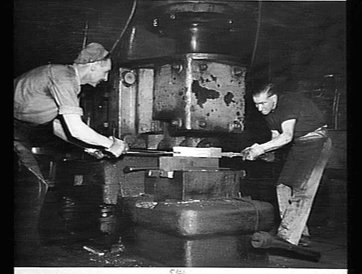 Black and white photograph of Blacksmiths Jack Hope (left) and Merv Brooks working with a large pneumatic forging machine at the H.V McKay Massey Harris factory in Sunshine.