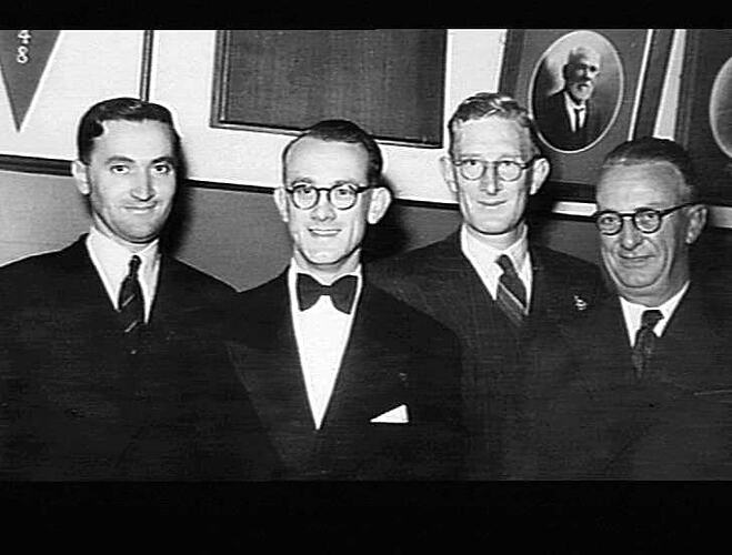 Black and white photograph of Adelaide's H.V McKay Massey Harris social and dance committee members at the company's annual function. Those seen in the image from left to right are: Harry Waters (committee President), Alex Balfour (Secretary), Ross D.E Catchlove and Bert Marcus.