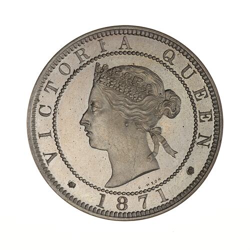 Within a beaded circle, a diademed head of the Queen facing left; around, VICTORIA QUEEN; below between two roses, 1871; the artist's name, L.C. WYON, below the neck