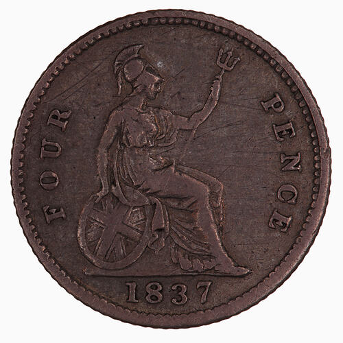 Britannia seated facing right holding a trident and resting right hand on shield; around, FOUR PENCE; in exergue, 1837