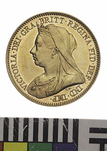 A proof gold coin (19 mm diameter with plain edge) featuring a crowned bust of Queen Victoria facing left, veiled and draped, wearing ribbon and Star of Garter; around VICTORIA . DEI . GRA . BRITT. REGINA . FID . DEF . IND . IMP . , the artist's initials, T.B. are below the bust. The reverse features St. George on horseback holding short sword in right hand, wearing a flowing cape, helmet and boots; the horse rearing to right over a fallen dragon which has a broken lance in its chest; the date, 1893 in the exergue. The mint mark S is in the ground above the middle of the date.