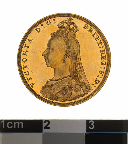 A gold coin (21.5 mm diameter with plain edge) featuring the Jubilee bust of Queen Victoria wearing imperial crown and facing left, a long veil falls behind the head, the bust is draped and decorated with the Star of the Garter, and also the badge of the Imperial Order of the Crown of India; around, VICTORIA D:G: BRITT: REG: F:D: , the artist's initials J.E.B. below the shoulder.The reverse features St. George on horseback holding a short sword in his right hand, the horse rearing to right over a fallen dragon which has a broken lance in its chest; in exergue, the date, 1893 and the artist's initials B.P.; the mint mark, S, is in the ground above the middle of the date.