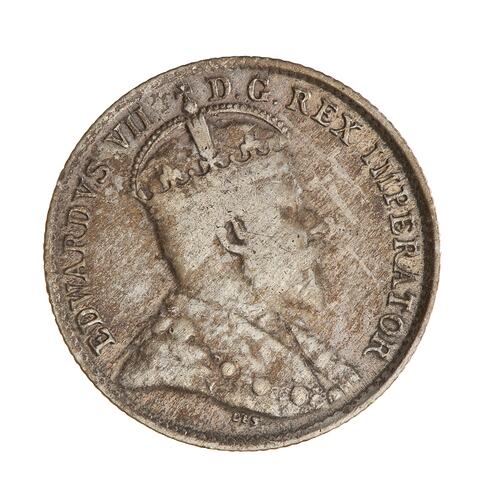 Crowned and draped bust of the King facing right; around, EDWARDVS VII D. G. REX IMPERATOR; the artist's initials, DES, in field below bust