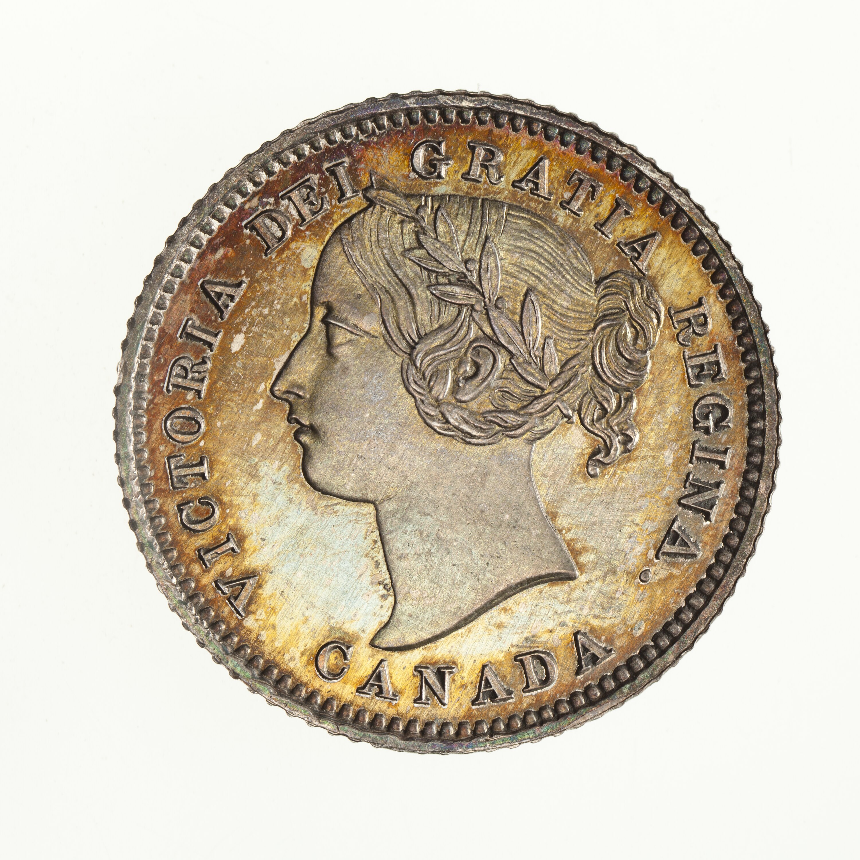 Laureate head of the Queen facing left; around, VICTORIA DEI GRATIA REGINA; below, CANADA