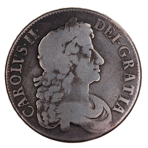 Laureate bust of Charles II facing right; around, CAROLVS . II . DEI . GRATIA