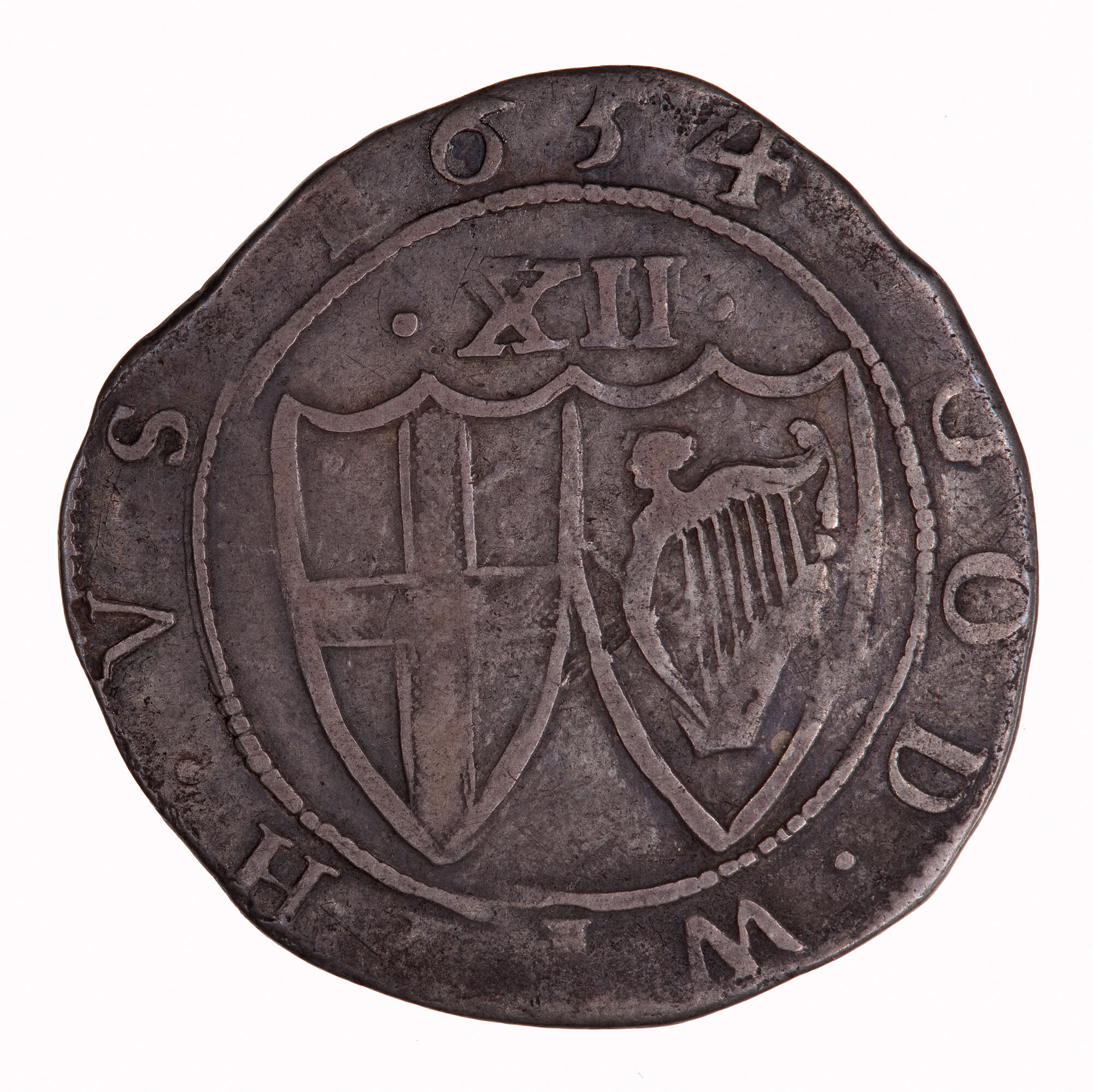 Within a beaded inner circle two conjoined shields, the one on the left bearing the cross of St. George and on the right, the Irish Harp; above, the denomination in pence, XII; around, GOD WITH VS 1654