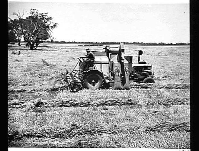 Experimental header harvesting down and tangled crop of oats near Elmore, Vic: Jan 1950. Refer Howard Taylor.