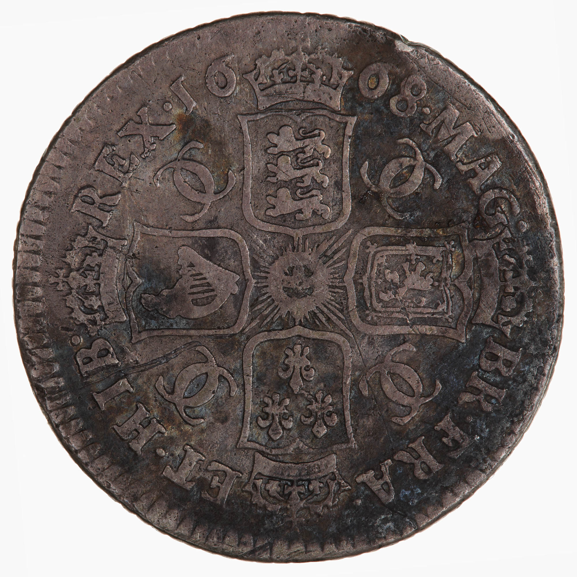Four crowned shields, bearing the arms of England, Scotland, France and Ireland, formed to make a cross with the Star of the Garter at the centre; in the angles, two interlinked Cs; around, MAG BR FRA ET HIB REX 1668, the date being divided by the crown above the English arms.