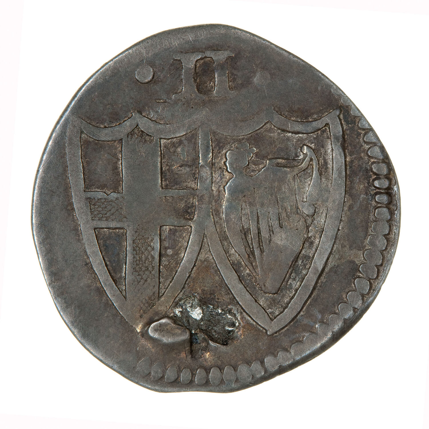 The Tower mint had been ceased by the Parliament in 1642 but it continued to mint in the name of Charles I until the monachy was abolished by Parliament in 1649. The value indicated by the Roman numeral II above the shields on the reverse. This coin is also known as a halfgroat.