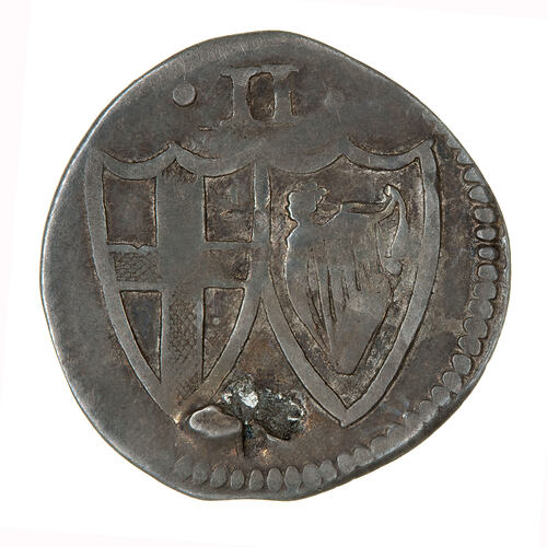 Within a beaded circle two conjoined shields, the one on the left bearing the cross of St. George and on the right, the Irish Harp; above, the denomination in pence, II