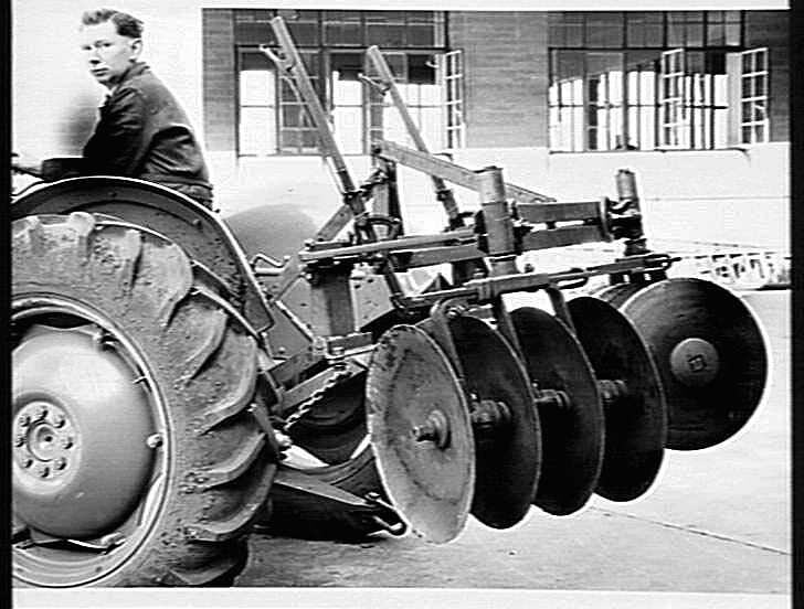 A 'Sunking' 8-disc cultivator, in the raised position, fitted to the 3-point linkage on an imported Ferguson Model'Tea' tractor. This implement was used for light work in orchards, vineyards and small farms. Discs were offered in 20 or 22 inch in plain o.