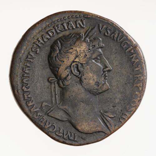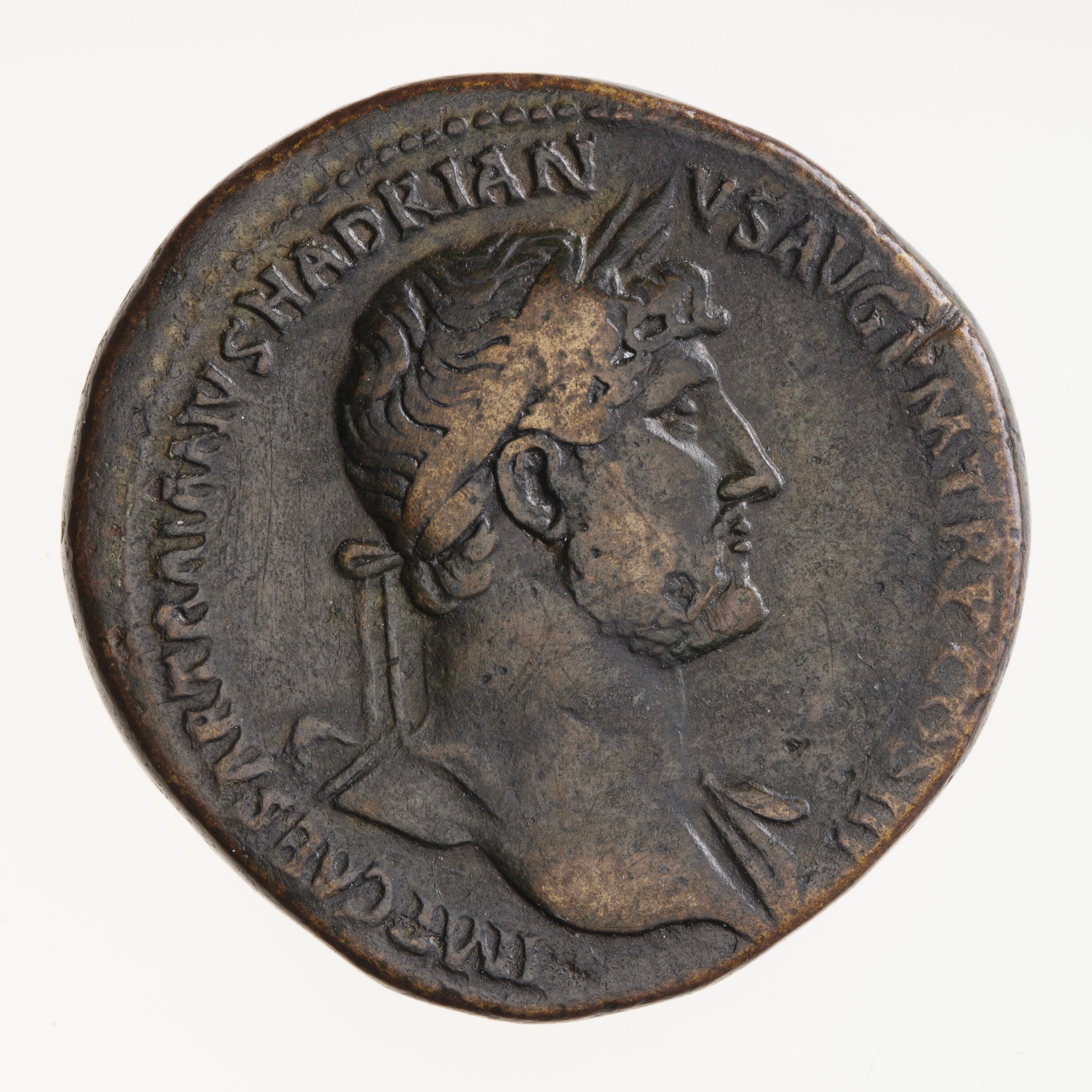 Orichalcum Sestertius of the Emperor Hadrian struck between 119 and 122 AD, Ancient Roman Empire. Minted by Rome. Hadrian was consul for the third time (COS III on the obverse this coin) in 119 AD. In 122 AD reference to the consulship was shifted to the reverse legend. Production of this coin, based on the form of the obverse legend, was between 119 and 122 AD.