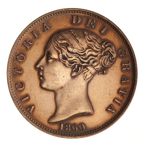 Head of Queen Victoria facing left, plain bands in hair; below, 1860; around above, VICTORIA DEI GRATIA; the artist's initials W:W. incuse on neck truncation