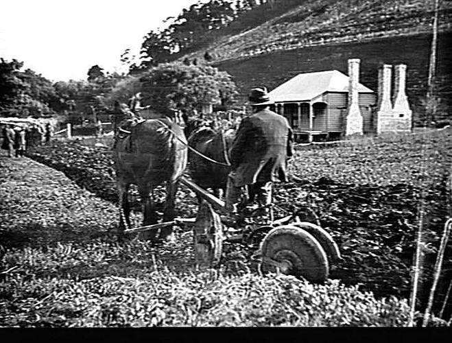 A horse-drawn 'Sungrade' reversible plough at work at Mount Buningyong. It was a simple operation to turn the discs 180 degrees, thus reversing the disc-throw of soil. The operator could plough up and down in line rather.