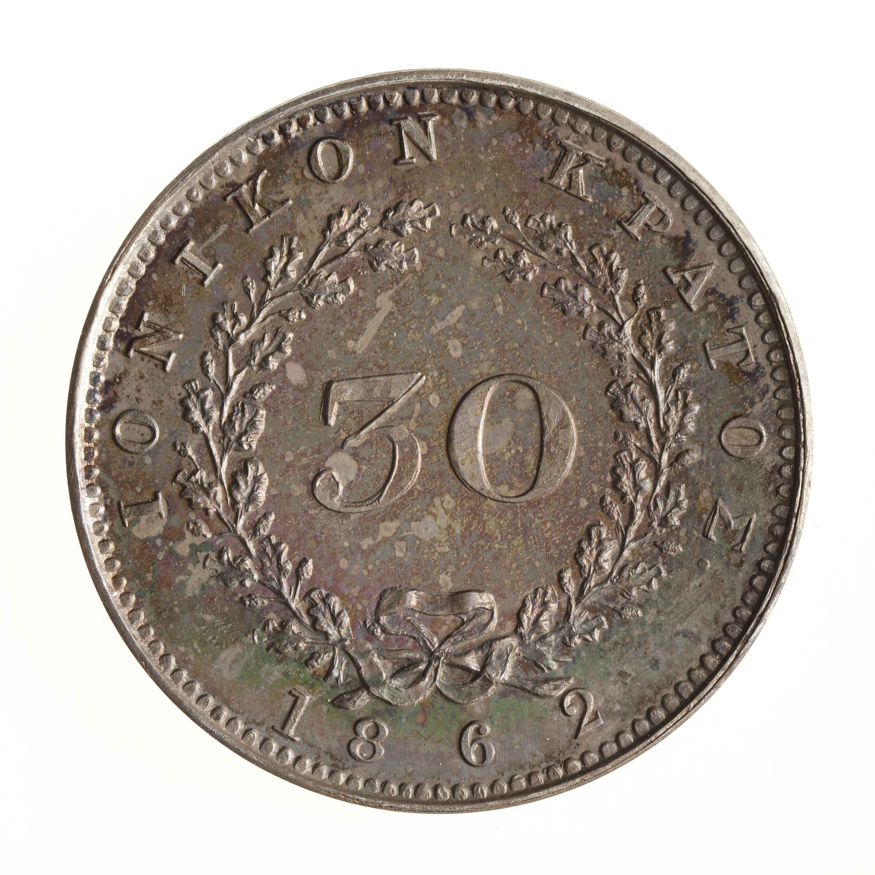 At centre within an oak wreath 30; around above in Greek, IONIKON KRATOS; below, 1862