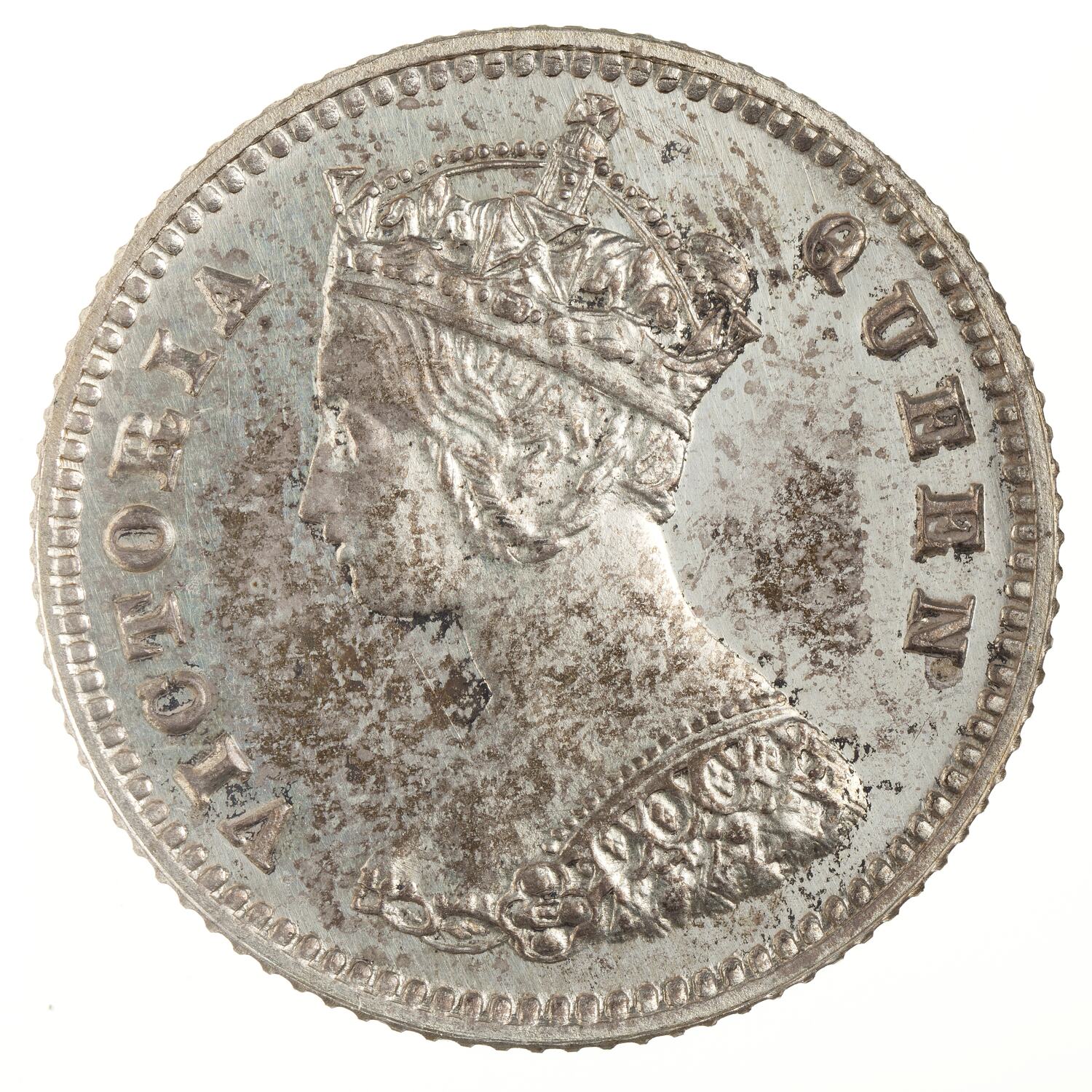 Crowned bust of the Queen wearing an ornamental bodice facing left; around, VICTORIA QUEEN