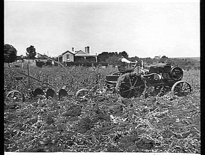 3-furrow Sunshine disc plough, drawn by a Sunshine Model 'A' benzene (petrol) tractor. The farmer is ploughing-in what appears to be scotch thistles. The farm house can be seen in the background. Note the Model A design's distinctive cylindrical radiator.