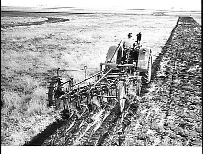 PLOUGHING PASTURE LAND COVERED WITH VERY HIGH, DRY GRASS, AT WILLAURA, VIC., WITH A 7-FURROW SUNRISE STUMP-JUMP MOULDBOARD PLOUGH FITTED WITH AUTOMATIC LIFT AND DRAWN BY A SUNSHINE MASSEY HARRIS TRACTOR. MAY 1948.